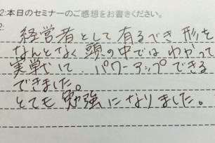 大切なコトをいろいろ学べたと思います。今日学んだコトをどう活かしていけばよいかを考え、強い組織を作っていきたいと思います。ありがとうございました。(工務店代表、30代、男性)